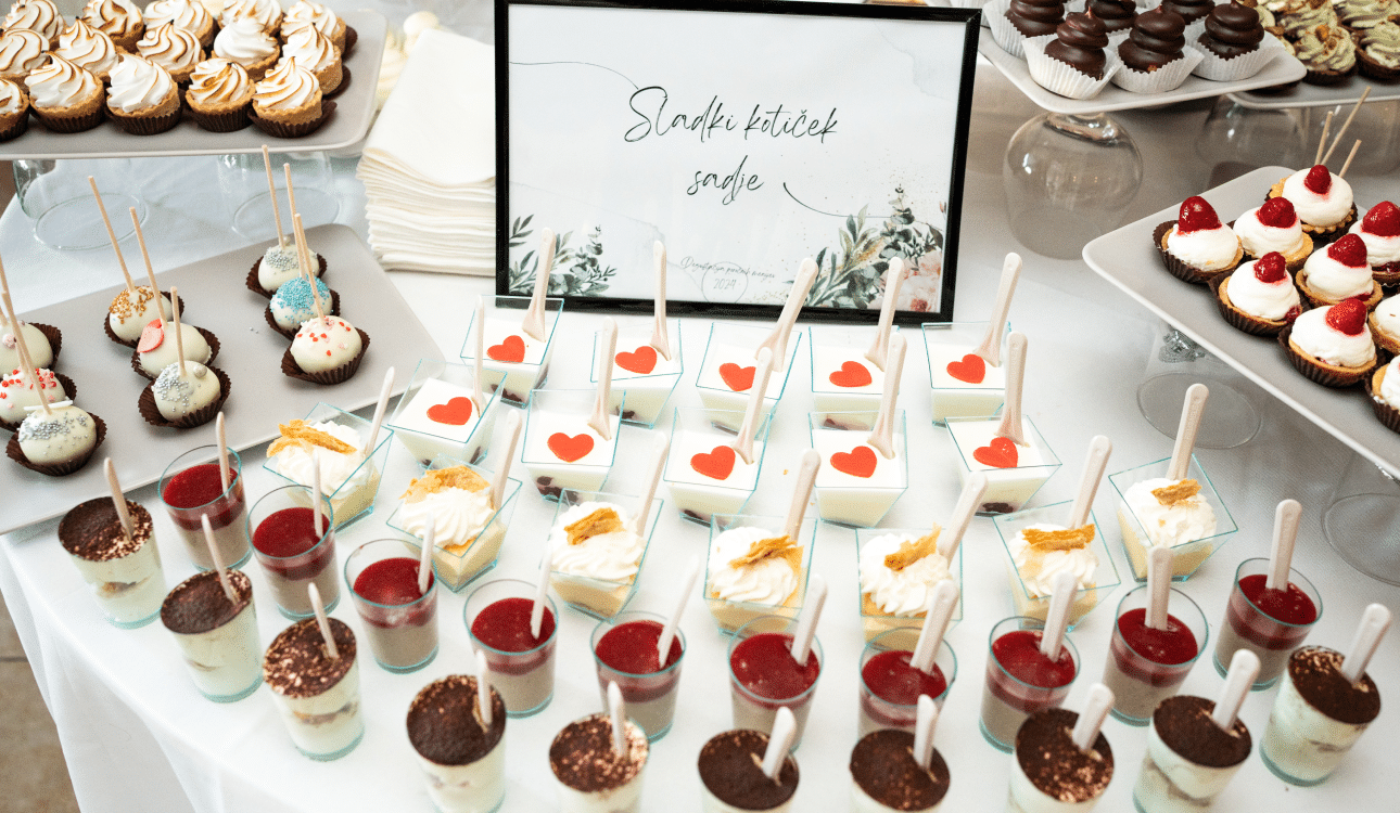 - Poročne torte in sladki kotiček so sladki vrhunec vašega dne, kjer se umetnost in okus prepletata v popolni harmoniji. Z raznovrstnimi dobrotami poskrbimo, da bo vsak grižljaj prava poslastica za vas in vaše goste.